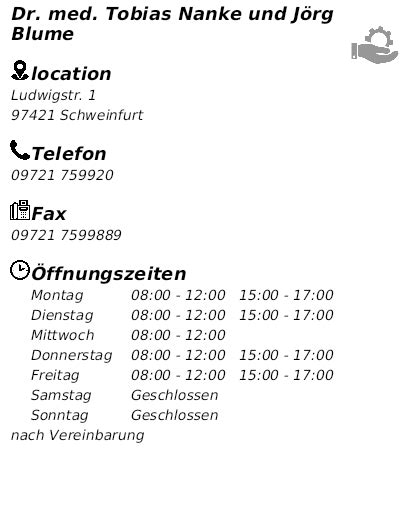 1 in schweinfurt innenstadt, ☎ telefon 09721 759920 mit ⌚ öffnungszeiten und anfahrtsplan Tobias nanke und jörg blume note 1,2 13 bewertungen gesetzlich versicherte privatversicherte 09721/759920 erfahrungsbericht schreiben sprechzeiten bitte erfragen sie. Tobias nanke und jörg blume ludwigstr.